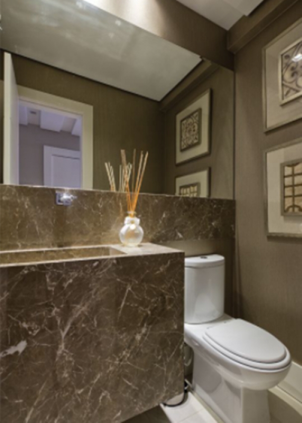 O mármore possui alta qualidade e dá um ar de luxo e pompa ao banheiro.